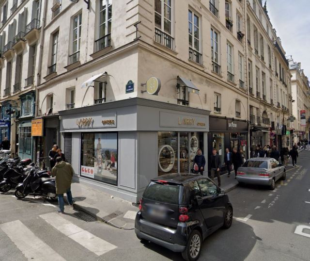 On another corner at the same intersection with the rue des Moulins, much of the space has been filled in and the windows are smaller.