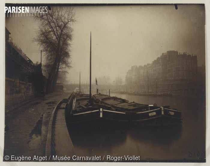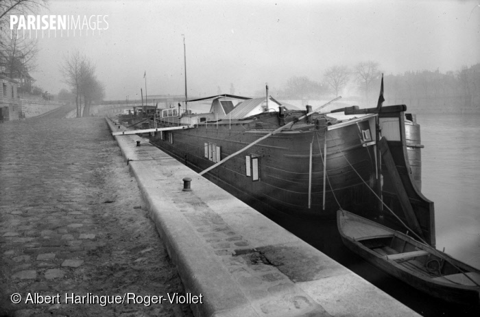 The next photo, taken by Eugène Atget in 1923, provides a moody depiction of two péniches in the quays. The large buildings and boats disappearing into the background on the far bank of the Seine add to the sense of a still foggy morning. It is all rather dreamlike, but was probably cold and damp.