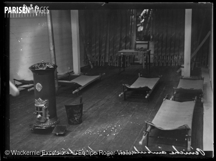 Péniches served as more than just freight carriers, though. The interior of this ambulance péniche, photographed in October 1914, is spartan. It appears to have only stretchers surrounding the central stove. Stretchers would have been in great demand at the time.