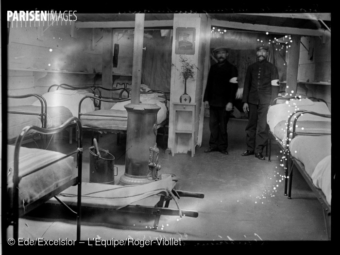 A month later, this is the interior of one of the ambulance boats established by l’Union des Femmes de France. This interior is much less grim, with flowers and proper beds for patients.