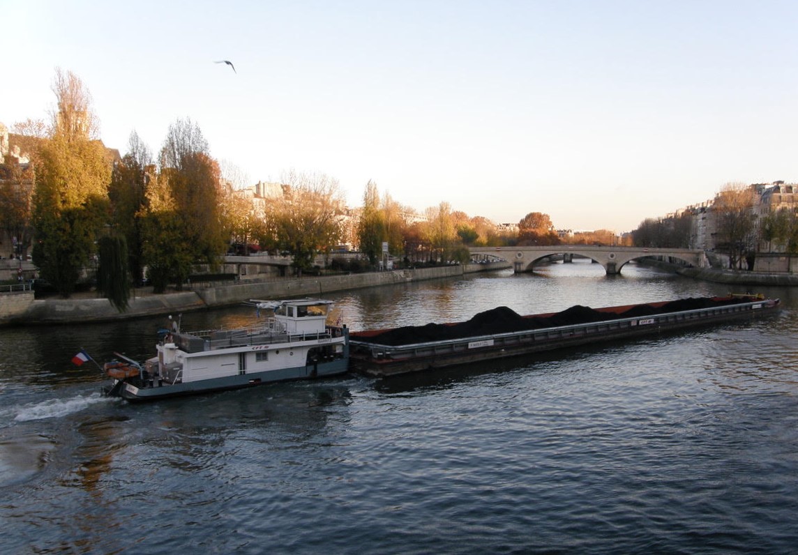 A November day some years ago. We are dawdling by the Seine when we spot a barge filled with coal being pushed up the Seine.