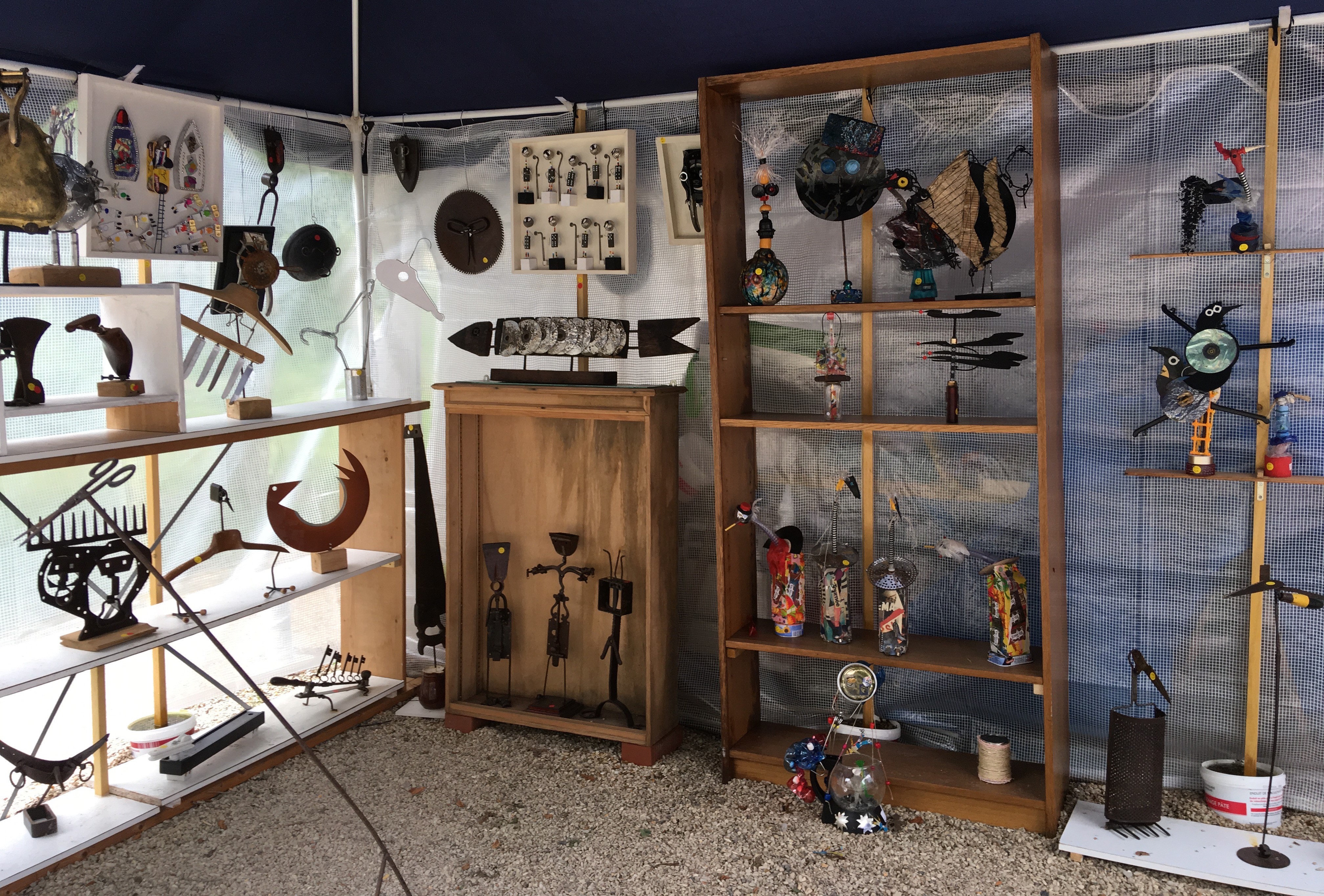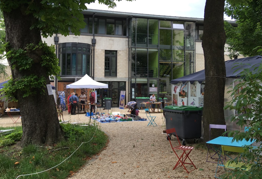 Probably better to carry on down the route of St-Jacques. On the southeast corner is the Protestant Institute of Theology. Despite its dry-sounding name, it clearly employs some creative and whimsical people. Once we were passing with some friends and saw a sign on the door inviting us in. The little front garden inside the wall was filled with artwork made from found objects. We went inside to see more displays. In an interior courtyard the artists themselves were at work, drawing from a pile of random objects spread out on the ground. Protestant theologians have some delightful pastimes, it seems.
