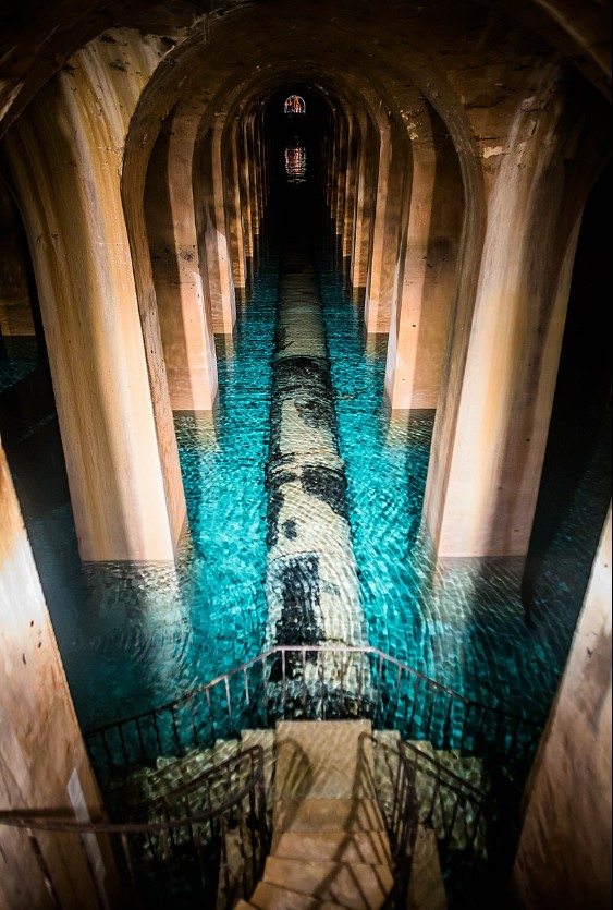 Past the last of the apartment blocks on the left, the view over an ivy-covered wall provides a glimpse of the reservoir Montsouris. Finished in 1874, and one of five reservoirs serving the city, it might seem to be a purely utilitarian water holding tank. But a photograph of the interior shows a water palace.