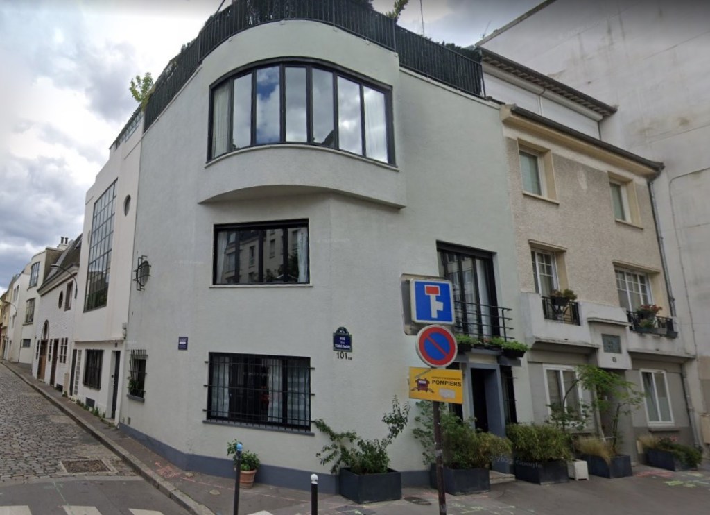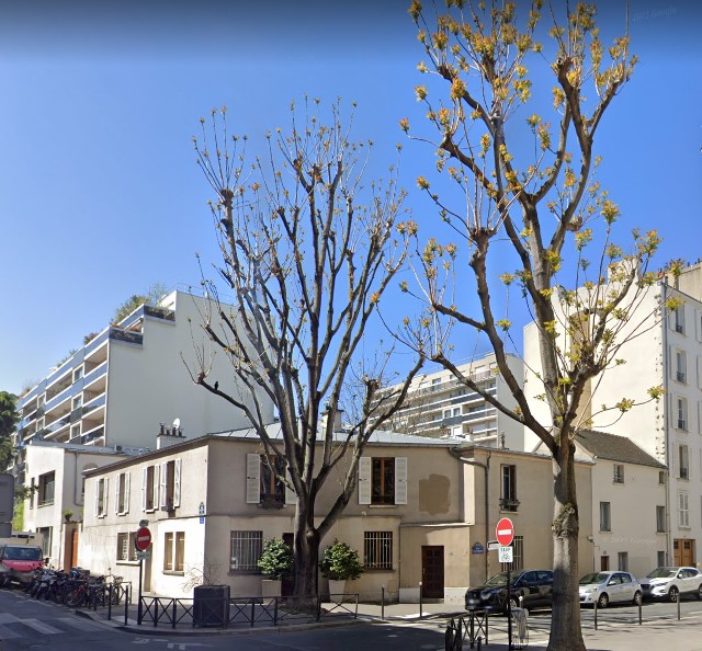 The road continues, over a cobble-stoned section with narrow lanes leading off on the left. Many of these little private or semi-private streets are called “villas,” such as the Villa Hannibal and the Villa Seurat. On the latter, note the lovely Art Deco building on the corner. The huge north-facing windows indicate a studio within.