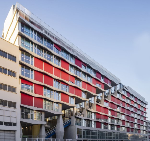 Past the playground is a very modern building on the left. This is the Jourdan campus of the Ecole Normale Supérieur / Paris Sciences et Lettres, a teacher training establishment. The school retains a historic building near the Panthéon. On the other side of the street is a recently completed student residence slashed diagonally by a long staircase. The windows have red coverings on the outside. I wonder how the residents raise and lower them. And whether anyone really uses the staircase.