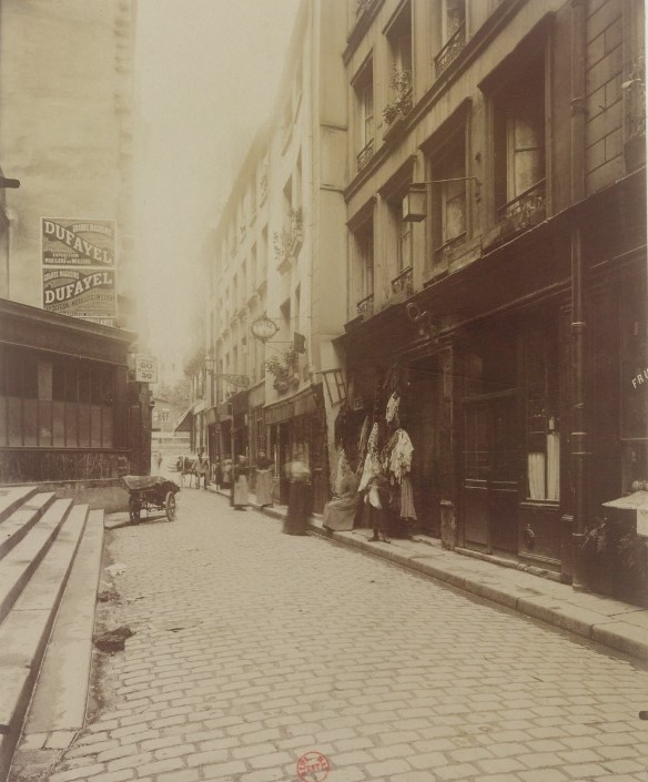 I began by leafing through our huge book (more than 700 pages) of Charles Marville’s photographs. On my first pass, nothing quite fitted the specs, so I started again, peering at the images more closely, noting streets that might be candidates and hoping that the one I sought was not among those listed as “disparu.” In the section on the area of St-Séverin and the Place Maubert in the 5th arrondissement, a couple of photos looked promising. So I looked online for other photos of the area by other photographers.