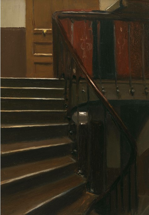 The painting of the staircase is small, little more than 12 inches high and 9 inches wide. The very tight cropping, leaving out the lefthand wall, the top of the door and the rest of the landing (is this the top floor or is there a further flight of steps?) makes the illustration in the book look like a detail from a larger painting, but no, this is exactly what Hopper wanted to show us, no more and no less.