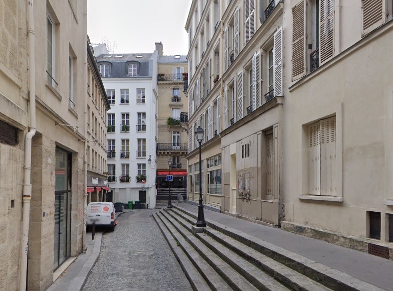 The main clue was the presence of steps on the righthand side. Not many streets in Paris look like that. Another clue was the way in which the street comes to a T-junction in which two different buildings are visible.