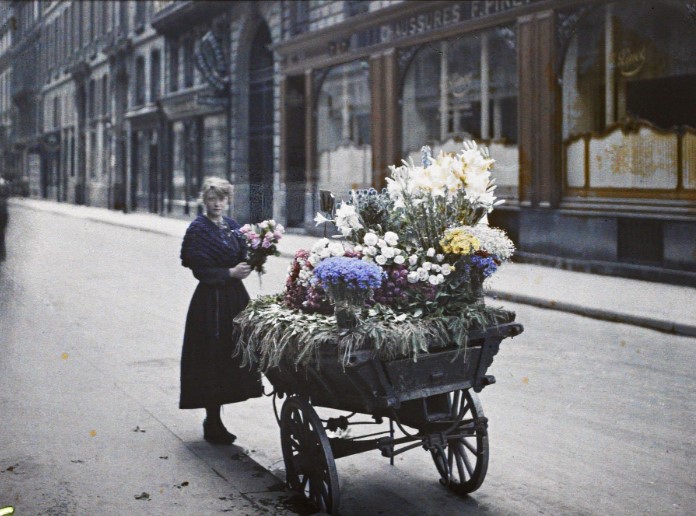 Here is one example of the colour photography possible at the time, showing a Parisian flower seller, taken by Auguste Léon in 1918. Unlike the hand-tinted images of the time, this showed the actual colours of the street and the flowers.