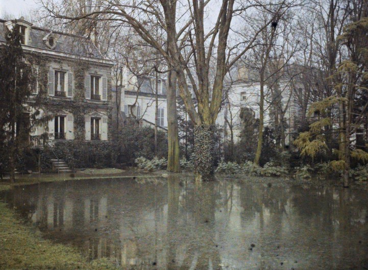 A rising financial star had to be suitably accommodated. In 1893, Kahn rented a brick-and-stone hôtel particulier on rue du Port in Boulogne-Baillancourt, not far from the Rothschild’s family château. The image below was taken in 1924, during a flood that covered the lawn.