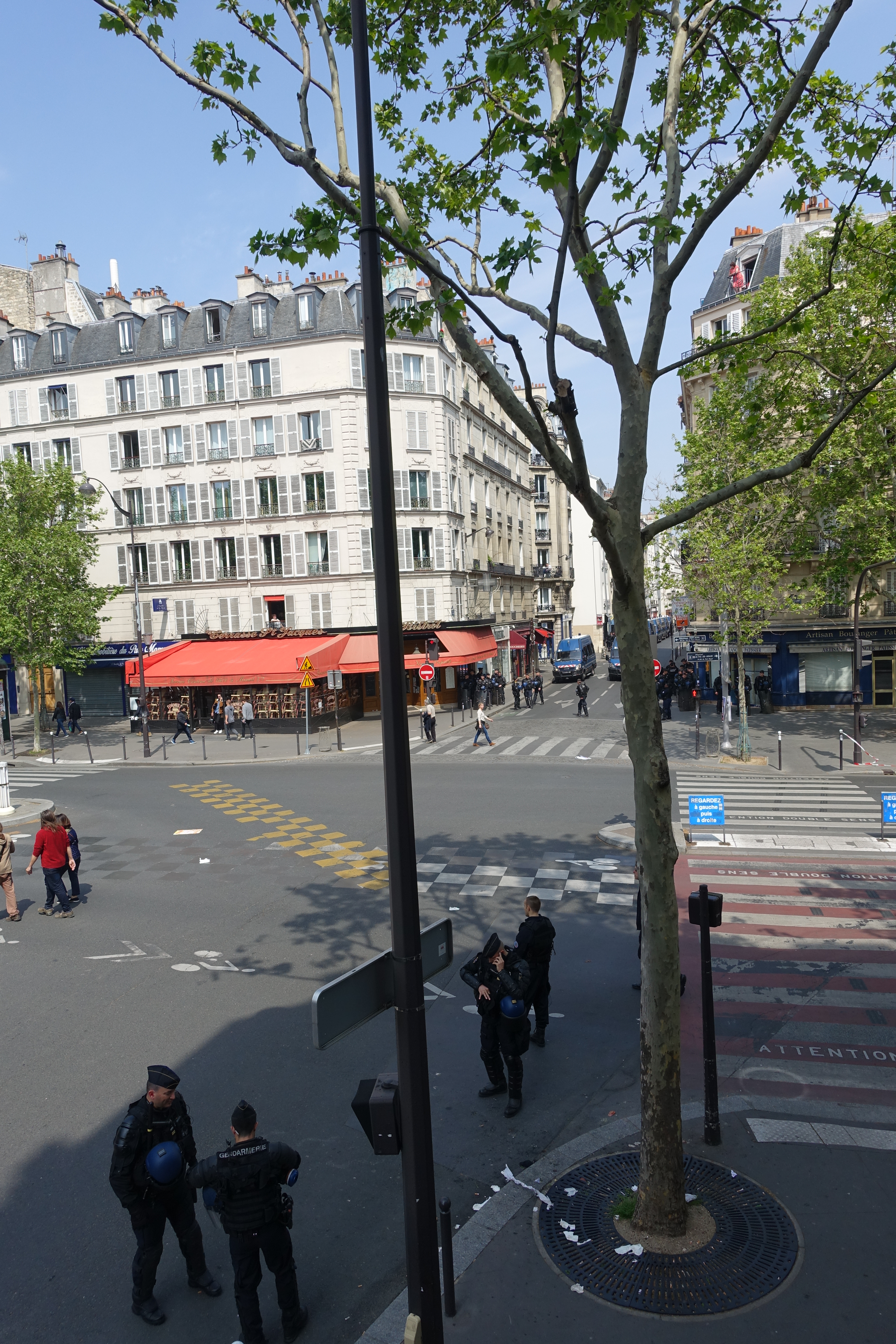 Here it is, on May 1, 2019, just before the May Day parade, which accounts for the lack of traffic in the intersection and the heavy police presence. If trees are silent witnesses to history, our plane tree saw a bit of history that day, when the parade and the gilets jaunes were particularly lively.