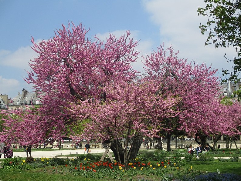 There are fig trees and hornbeams and ginkgos galore. A Judas tree in the Tuileries (shown below). Weeping willows trailing their leaves in the Seine. Persimmons and sweet gum in the Bois de Vincennes and a handkerchief tree in the Bois de Boulogne. Tulip trees in the Cité universitaire and a Kentucky coffeetree in Square Robert Schumann in the 16th (both of the latter are also trees that grow on our street in Toronto).