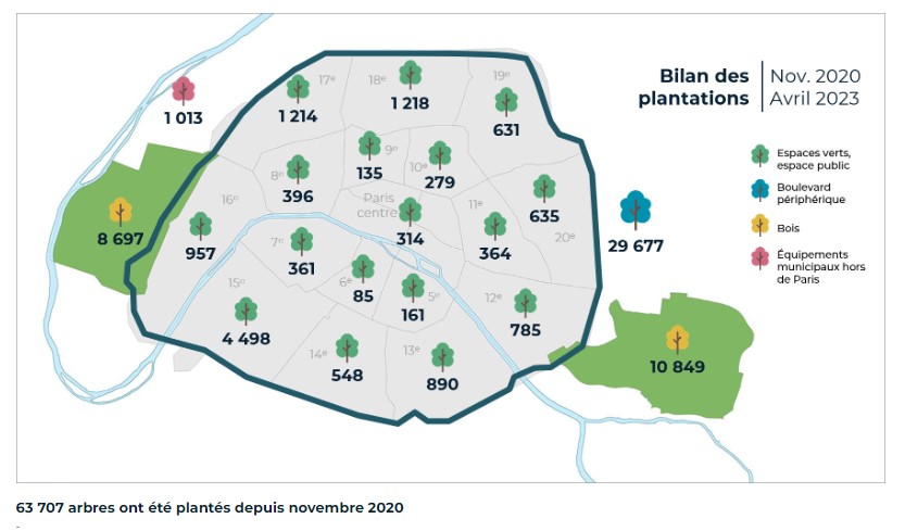 Officially, the city has promised to plant 170,000 new trees by 2026 to reduce the urban heat island effect (that is, the heat that builds up in paved areas without green space – think the Avenue de l’Opéra in July). Between November 2020 and April 2023, the city planted 63,700 trees. Some are new; some replace dead or dying trees. That means 107,000 more to go in the next three years.