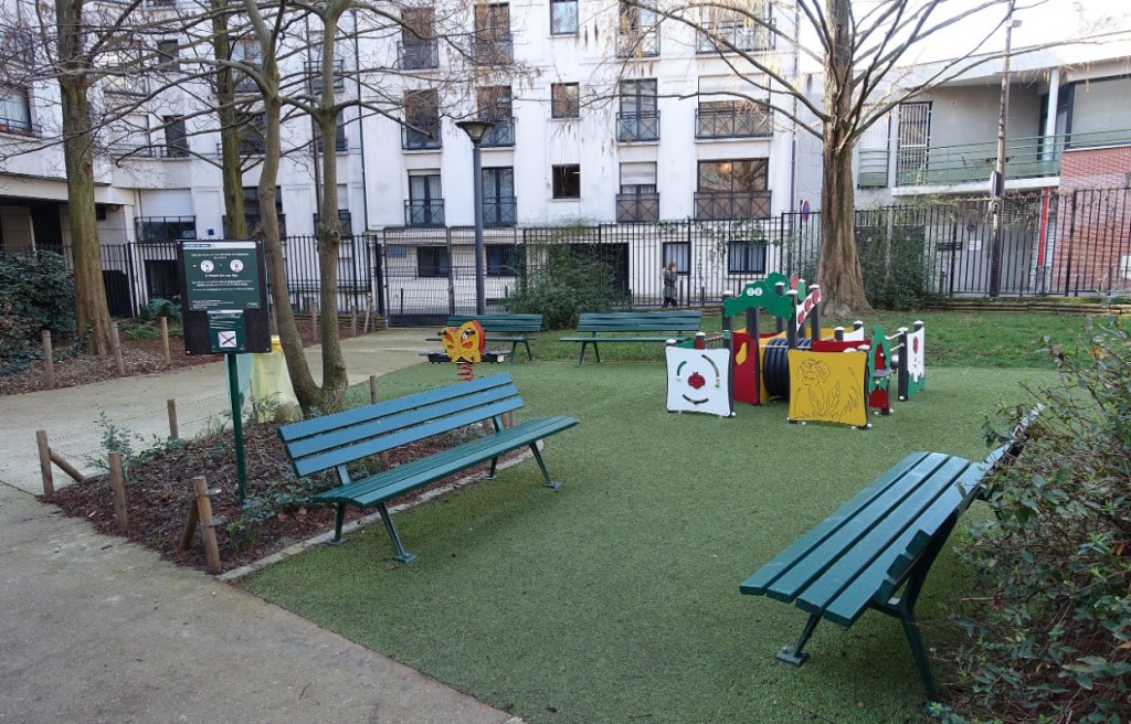 There is even a dawn redwood (Metasequoia glyptostroboides) in the Square de la Villa Sainte Croix in the 17th. This tree is familiar to us, as several of them grow in a nearby park in Toronto. It’s an odd-looking thing, with branches that emerge at sharp angles from the folds of the trunk (look at the tree behind the playground equipment on the right).