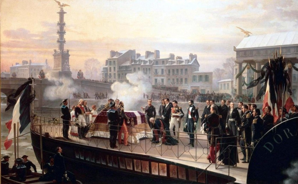 One of those chosen to oversee the transfer from St. Helena was Henri-Gratien Bertrand. He was now a widower, Fanny having died in 1836. This image of the casket arriving at Courbevoie was painted by Henri-Felix-Emmanuel Philippoteaux in 1867: