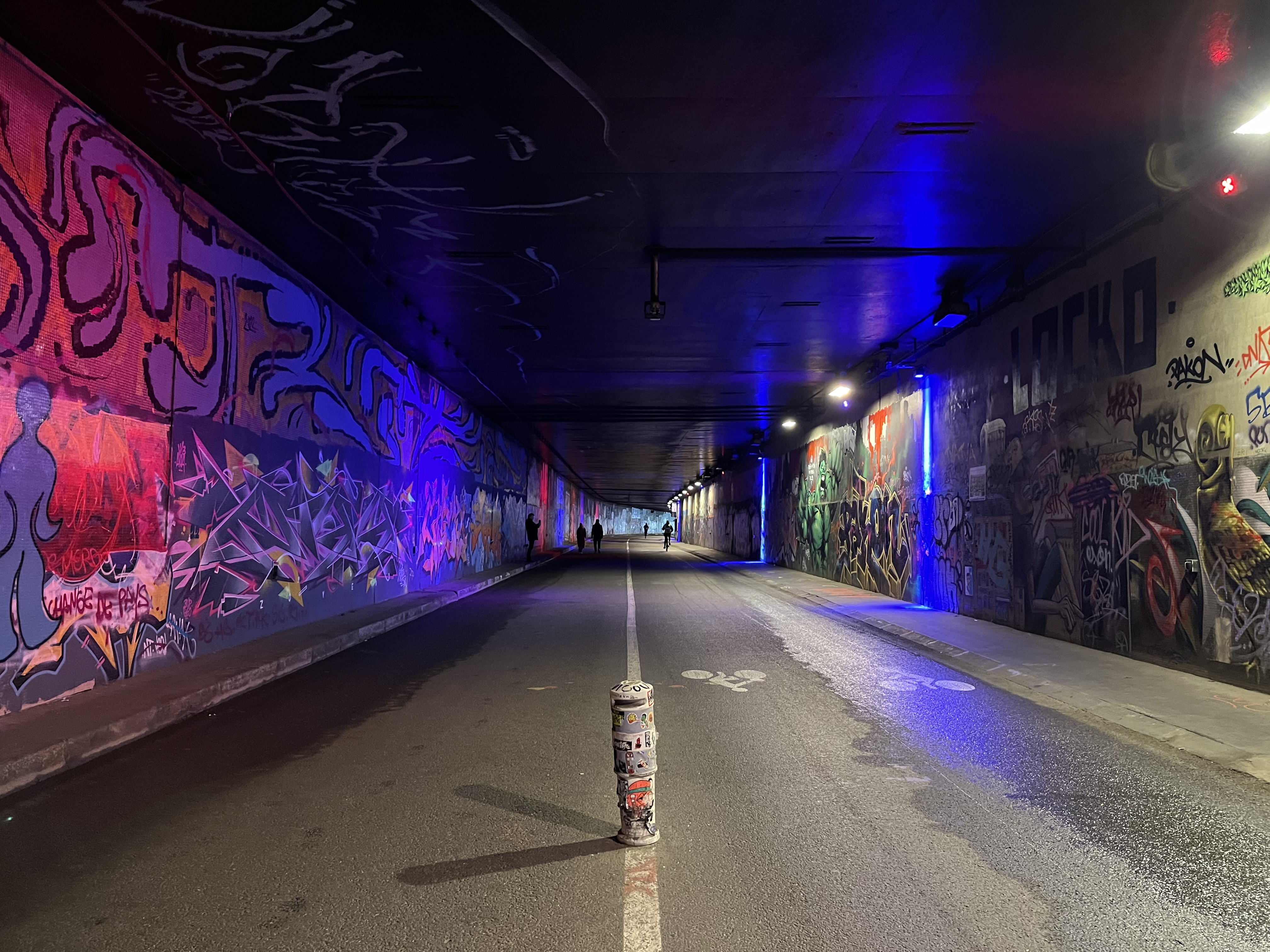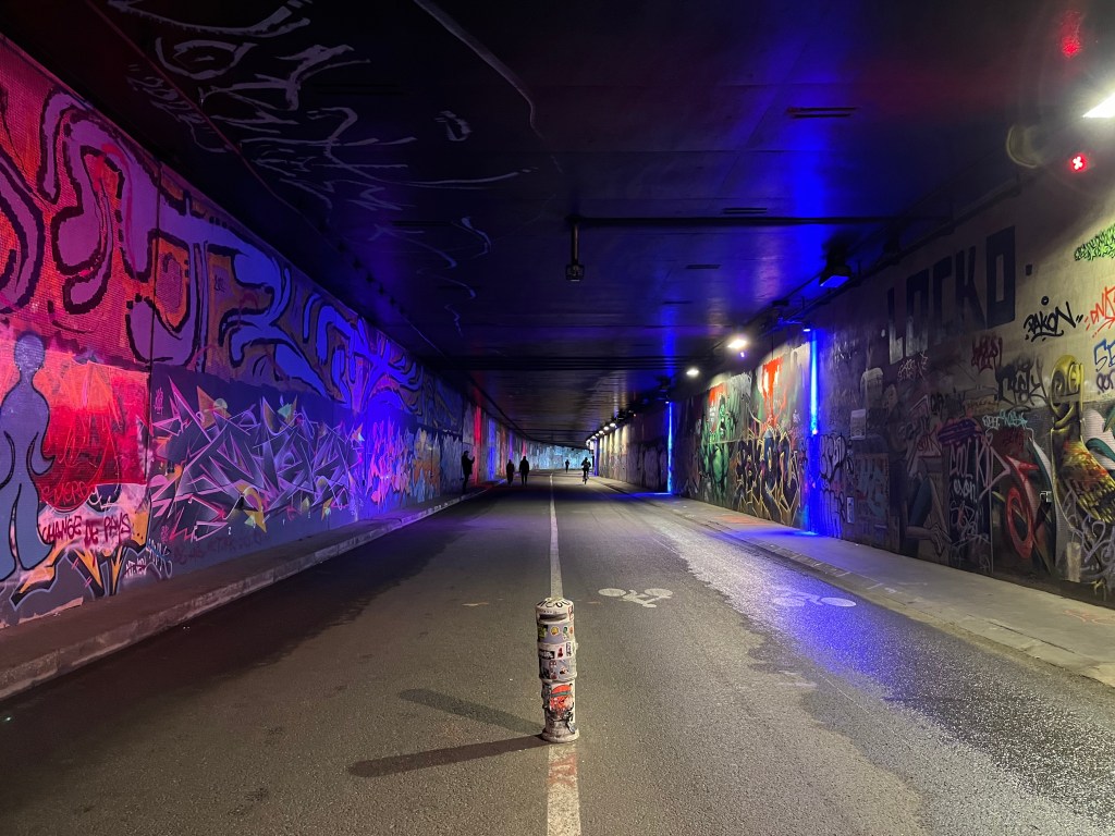 We had an unusual walk on the highway beside the Seine that is now closed to cars and open to pedestrians, cyclists, and scooters. A friend had invited us for a stroll by the river, but the water level was so high that part of the riverside path was closed. We ended up in a former highway tunnel. It was well lighted and ventilated, covered in graffiti (some of it sanctioned), and we emerged after more than a mile feeling faintly bemused but impressed.