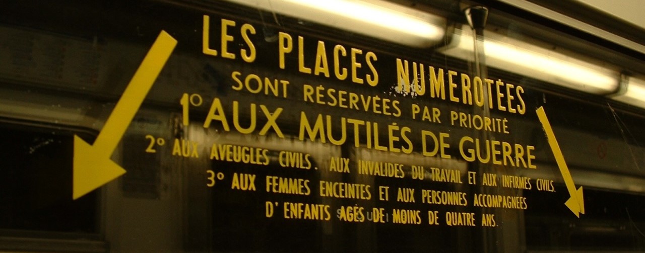 *The year that I was a student in France, the Metro cars all had signs on the windows for the seats nearby, reserved for “Mutilés de Guerre, Aveugles Civils, Invalides du travail et infirmes civils, Femmes enceintes, Femmes portant un enfant de moins de quatre ans sur les genoux” (people with war wounds, persons who are blind, people with work-related injuries or other infirmities, pregnant women, women holding a child of less than four years old on her knees). The wording has varied over the years, but clearly many passengers have adopted the tradition of giving up a seat to someone else from a young age.