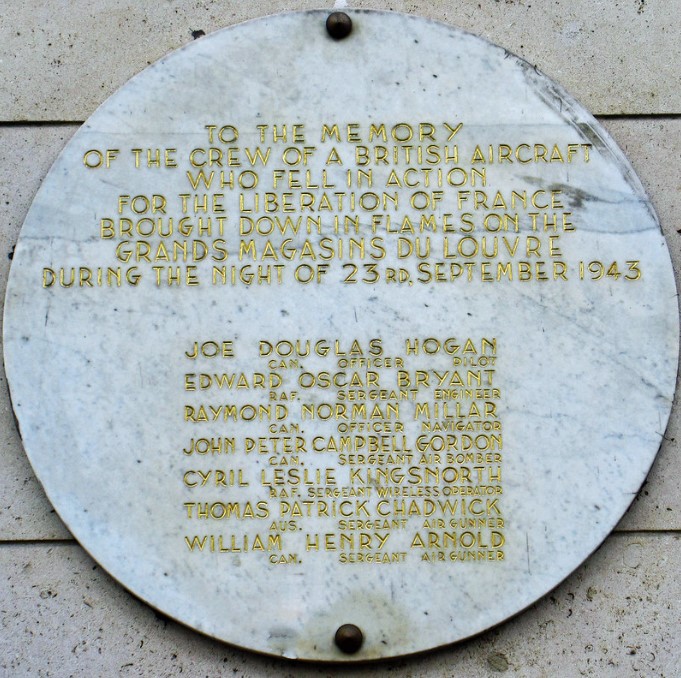 Most of the bombing occurred during 1943 and 1944. Before that there were only two major air raids over Paris: one on a factory in Chatou (a western suburb, not shown on the map) in June 1940 and the other on the Renault plant in March 1942. But in the following two years, the city was bombed repeatedly. In one case, an Avro Lancaster was hit by anti-aircraft fire from the German occupiers and crashed on to the roof of the Grands Magasins du Louvre on September 23, 1943. All seven crew members, four of them Canadian, were killed, and the building was extensively damaged.