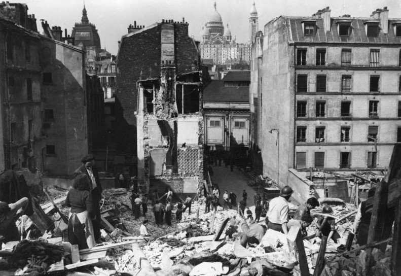 The following image of the rue Richomme in the Goutte-d’Or district, showing Sacré-Coeur and the Dufayel building in the background, was taken after a particularly destructive raid by the Allies on April 21, 1944.