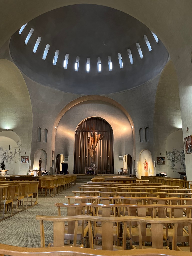 When you walk through one of the doorways, you find a jewel of a chapel surrounded by beautiful modern stained glass windows.