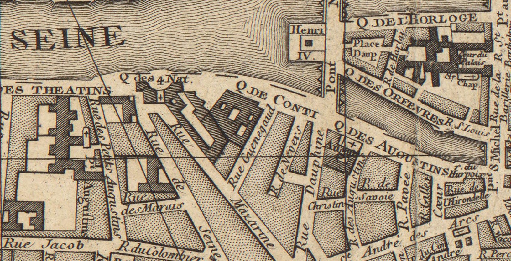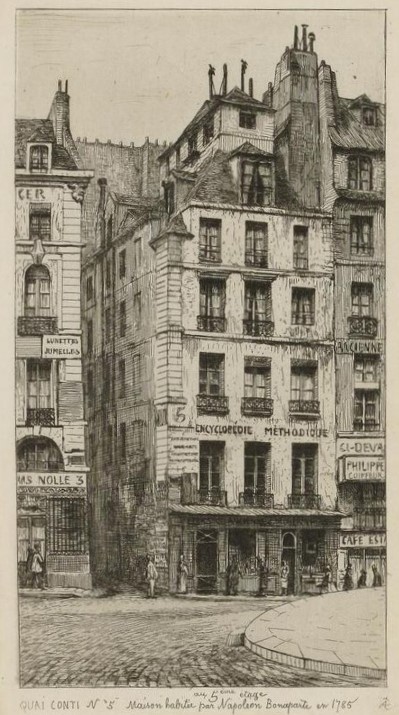 Broca is a medieval street that has gone through several name changes (the current one dates from 1890 and commemorates a doctor who also gave his name to the hospital at the southern end of the street). When I wanted to find out why the rue Broca goes underneath the boulevard Port-Royal, it took me a while to realize I was asking the wrong question. Rather, the 19th-century Boulevard de Port Royal was built like a bridge over this low-lying area, which was once part the valley of the Bièvre river. Here is a 1900 view of the river between the rue Broca and the rue Pascal, painted by Germain Eugène Bonneton.